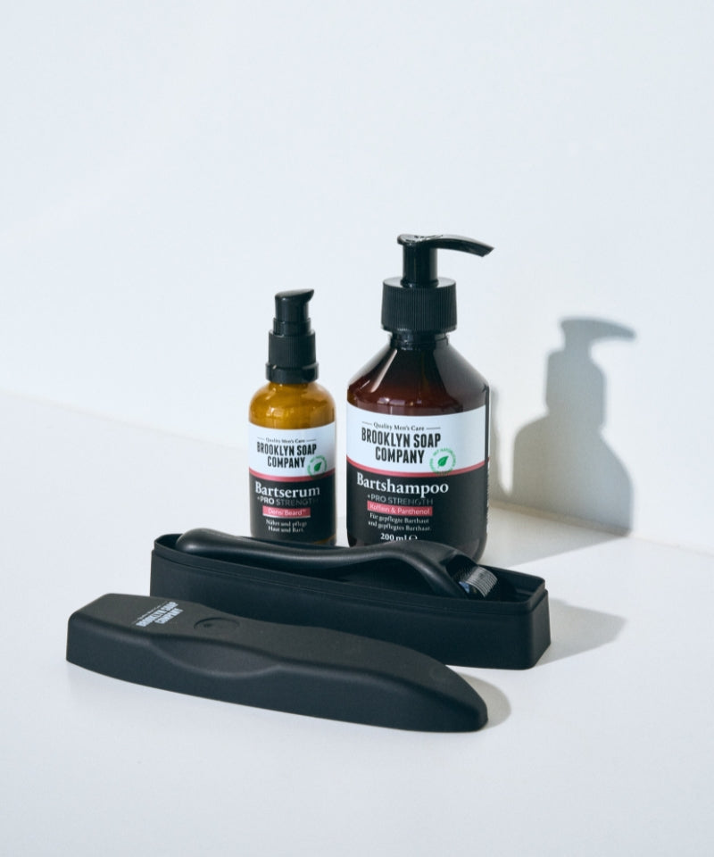 - Mit pflegendem Shampoo, anregendem Bartroller und aktivierendem Serum