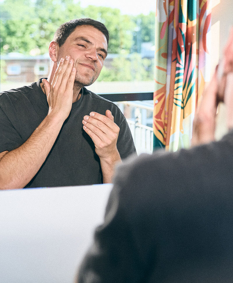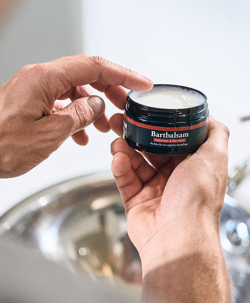 Spread a cherry-stone-sized amount between your hands and apply it to the clean beard area. Then massage the balm evenly into your beard and the skin under your beard. Done!