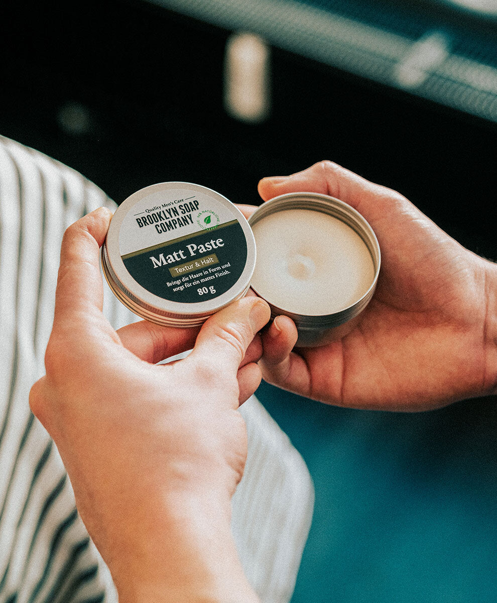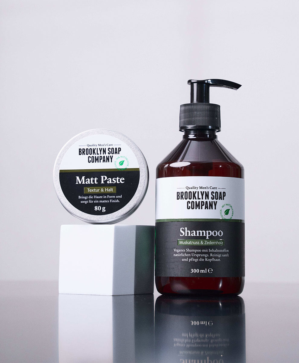 With the Hair Essentials, good hair days are guaranteed: The Shampoo cleanses your hair gently but thoroughly and is perfect for daily hair washing. Clean, sleek or out-of-bed look - our innovative Matt Paste brings casual cool to the point and gives your hair a natural, matt finish. You can look forward to the usual Brooklyn Soap quality - with natural ingredients, rich recipes and maximum tolerability. And the best? With the bundle you also get a really good deal and save 10% compared to buying it individually.